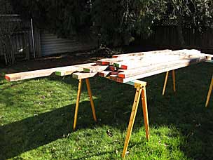 About a month ago I bought eight vertical grain 2x4’s for $70, and took them home in my Civic. Today I borrowed my friend Frank’s pickup and bought twenty 2x4’s of various lengths (mostly around eight feet), plus a 2x6 that’s about thirteen feet long. Apparently the guy who wrote up my ticket just couldn’t get the math right, because when I went to pay it only cost me $65! My calculation after I got home was that this should have been around $200.