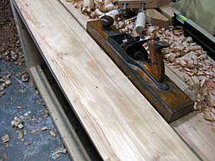 I figure the white paint is probably lead-based, so I don’t really want to disturb that. Therefore, I flipped the wood over to use that as the top side. The surface was stained and darkened with age. I used the belt sander, followed by the jack plane, and it cleaned up nicely.